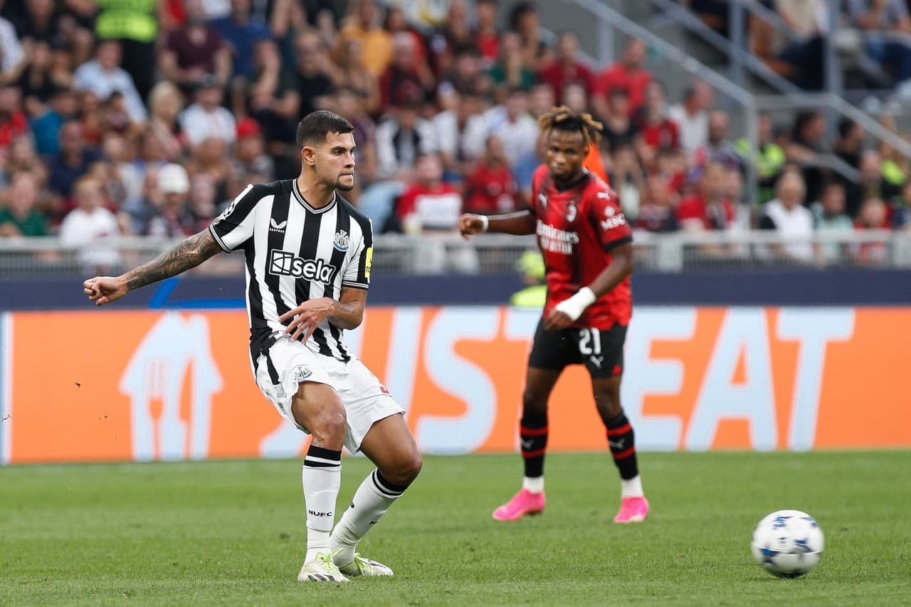 Italy, Milan, september 19 2023: Bruno Guimaraes (Newcastle Utd midfielder) pass shot in back court in first half during soccer game AC Milan vs Newcastle United, UCL 2023-2024 - Group F matchday 1