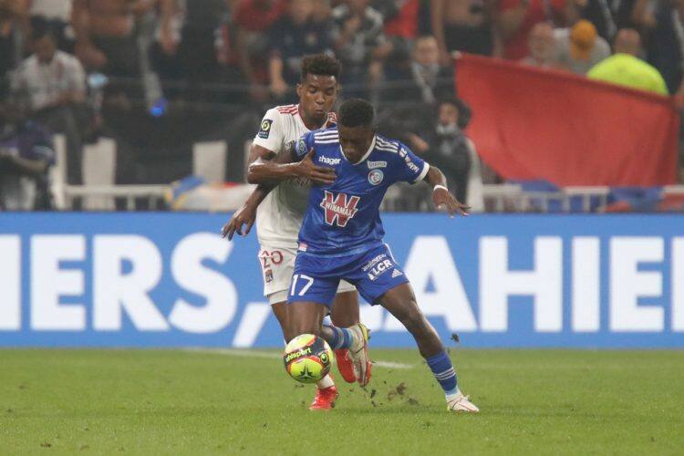 Jean Ricner BELLEGARDE of Strasbourg and Thiago MENDES during French championship Ligue 1 football Olympique lyonnais vs Racing Club Strasbourg 9-12-2021 Groupama Stadium Décines-Charpieu Lyon France