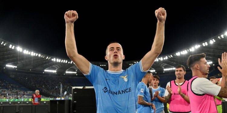 ROME, ITALY - SEPTEMBER 11: Adam Marusic of SS Lazio celebrates a victory after the Serie A match between SS Lazio and Hellas Verona at Stadio Olimpico on September 11, 2022 in Rome, Italy. (Photo by Marco Rosi - SS Lazio/Getty Images)