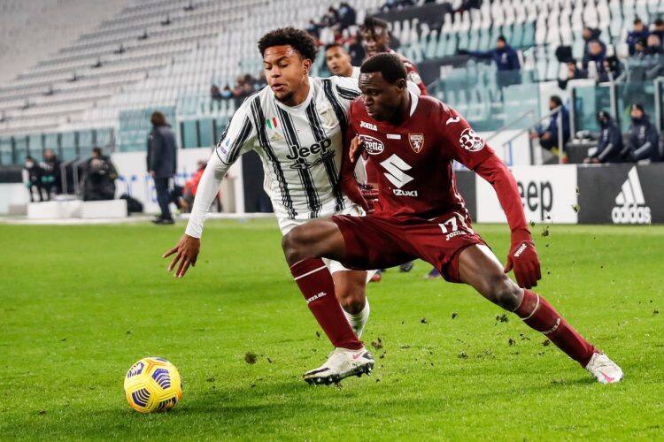 Turin, Italy. 05 December 2020. Italian Serie A Football Championship. Juventus VS Torino 2-1. Wilfried Singo, Torino, and Weston Mckennie, Juventus, vie for the ball.