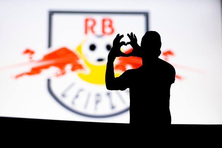 Young man making heart shape with his hands front of RB Leipzig logo, love for football club idea, RB Leipzig football team logo with fan silhouette, supporting soccer club: Turkey - 05.01.2023